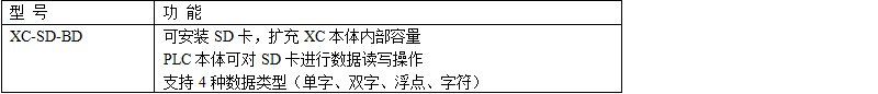 XC系列PLC適配左擴展BD板,可接入一個SD卡。 XC系列PLC一般可擴展1個BD板。 實現(xiàn)SD卡與PLC間數(shù)據(jù)的讀寫,主要為存儲備份數(shù)據(jù)用 支持最大2GB SD卡 XC本體軟硬件版本要求為V3.2及以上